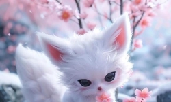 小萌宠 A cute and adorable baby white fox with a big fluffy tail,holding a pink flower lay on a cloud in parad ...
